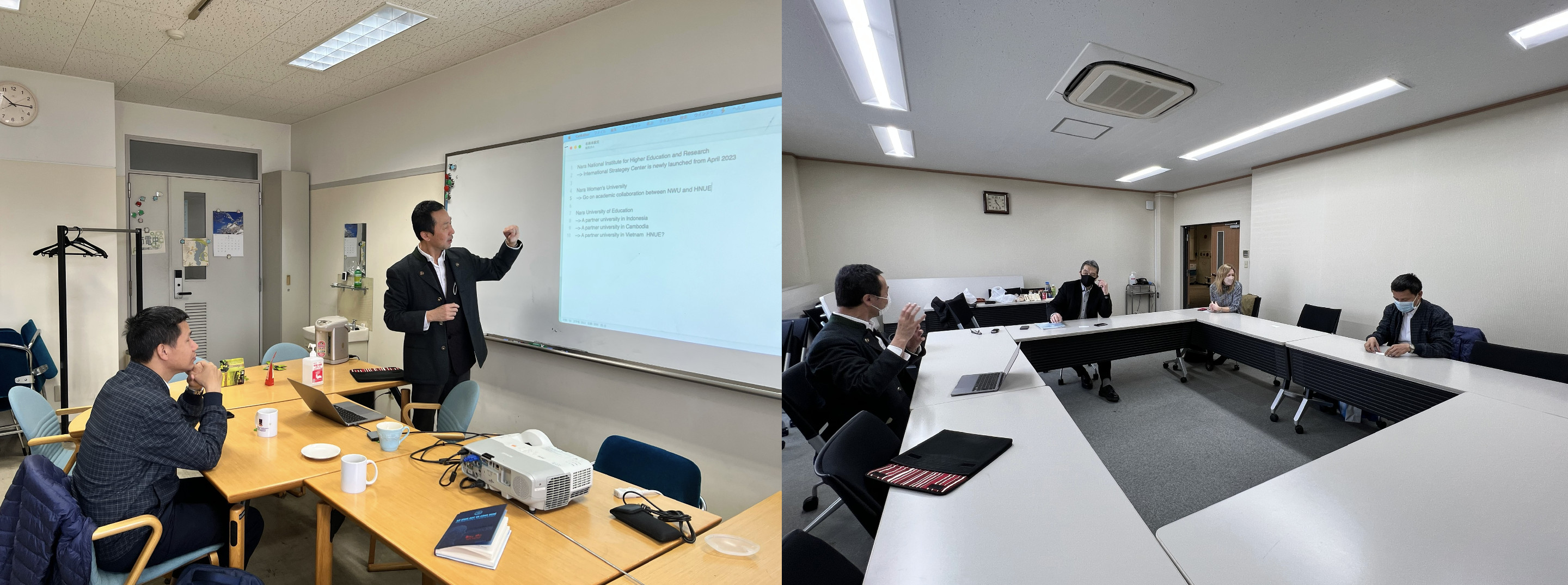 We would like to express our gratitude and warm-hearted thanks to Professors, students, and staff in NWU, NUE for your hospitality and attentiveness during our stay in Nara City. We will not forget your welcome and farewell parties, which were held warmly and happily with the participation of students and professors from NWU, UOL, and HNUE. We had the opportunity to talk and discuss with each other about life and culture in different countries, the research topics we are working on, and closer cooperation in the future.