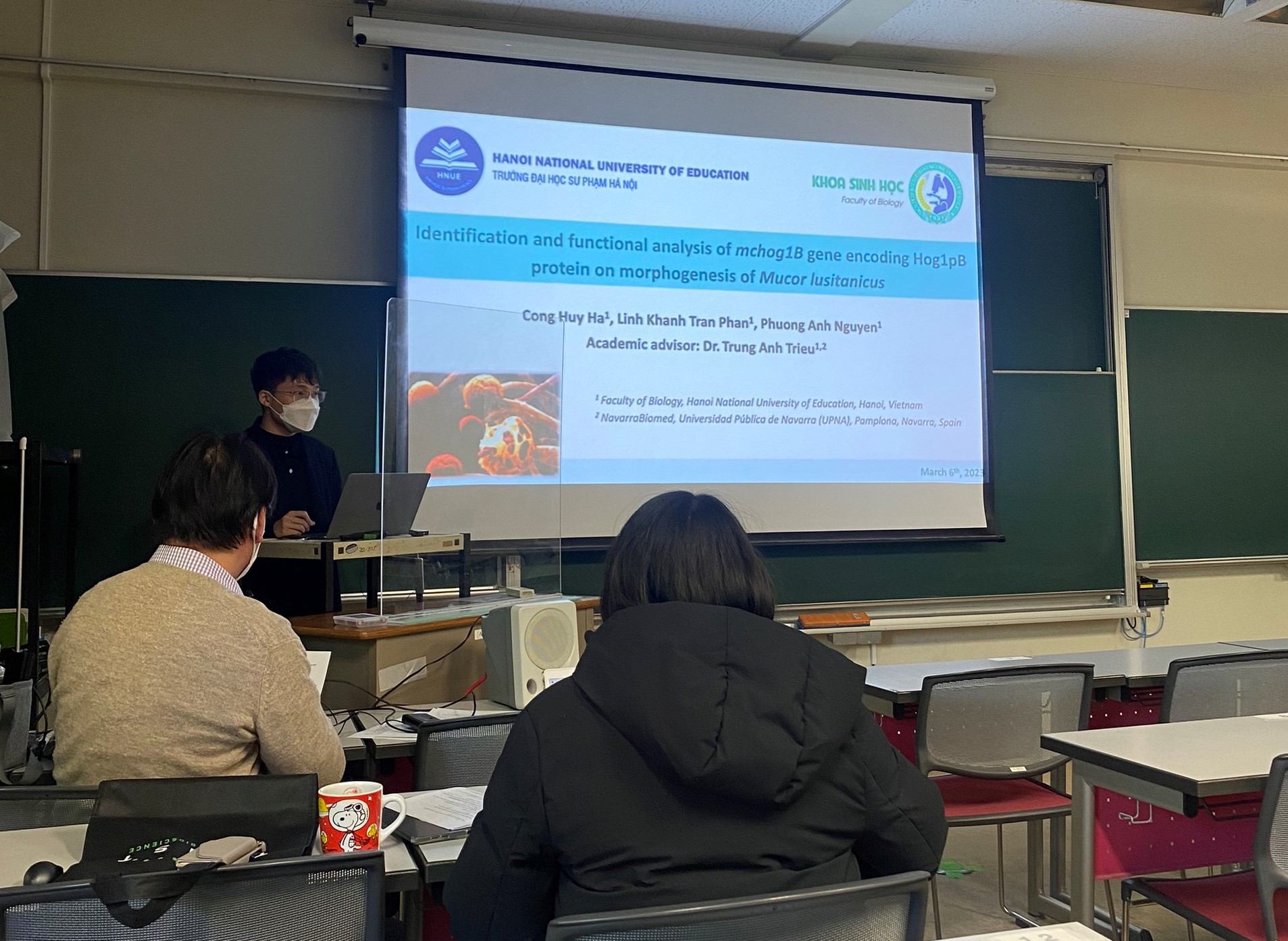 For the first activity in NWU, we participated in a mini-symposium organized by NWU according to a relationship with the University of Leicester (UOL), the UK. This is the 10th Symposium between the two institutes on Biosciences, focusing on Cell and Molecular studies. In this symposium, graduate students from UOL and NWU presented various mechanisms of many cellular and molecular biological processes in many model organisms. In addition, there was a presentation in the field of ecology from Payo Emilio García, a Ph.D. student at UOL. Mr. Cong gave a presentation titled “Identification and functional analysis of mchog1b gene encoding Hog1pB protein on morphogenesis of Mucor lusitanicus”. Mr. Cong delivered knowledge about the effects of genes encoding for Hog1 protein in M. lusitanicus on the growth, sporulation ability, and morphology of the fungus. This is a good opportunity for him to experience presenting his scientific research in front of graduate students and professors in the field of molecular and cellular biology, thereby providing an opportunity to expand his expertise in the field of Molecular biology.