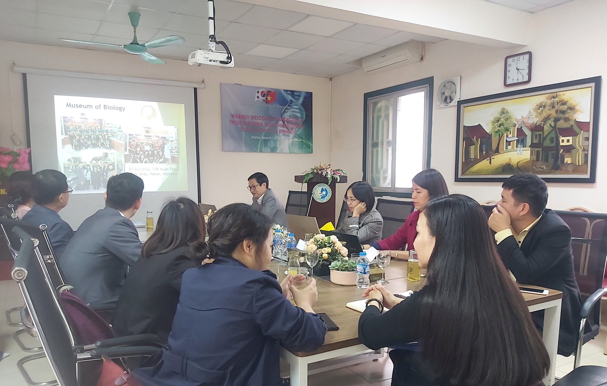 On behalf of the Faculty of Biology, HNUE, Assoc. Prof. Dr. Nguyen Lan Hung Son, the Dean warmly welcomed the delegation from the College of Natural Sciences to visit and discuss further collaborations. Later, Assoc. Prof. Dr. Nguyen Lan Hung Son briefly introduced information, such as mission, faculty members, research and training fields of seven departments in the faculty.