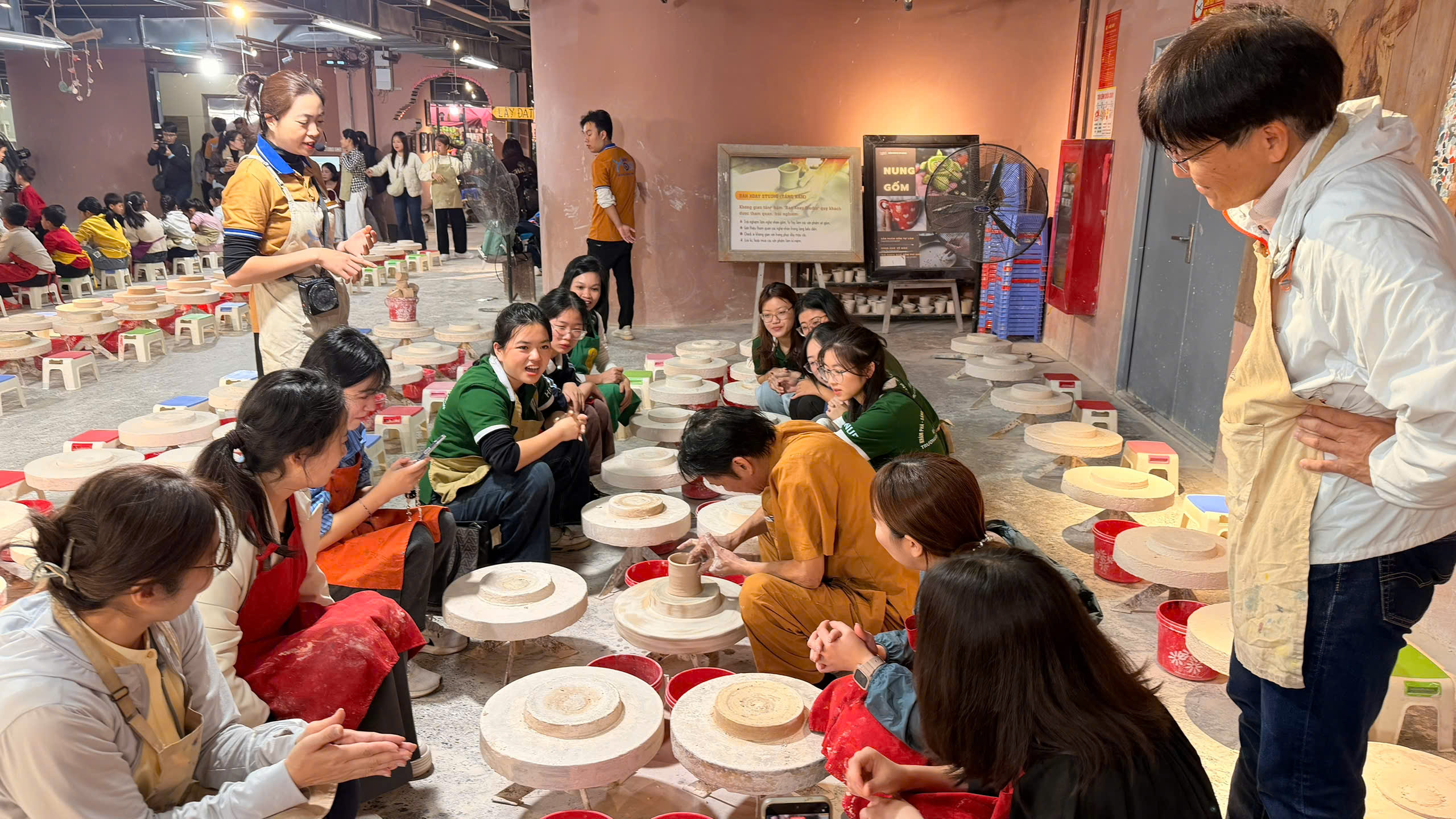 The delegation learned about more than 700 years of ceramic history, iconic product lines, and the evolution of the craft village. The museum’s unique architecture and modern exhibition space left a strong impression on participants. At the pottery workshop, professors and presenters engaged in hands-on clay modeling, allowing them to experience the craftsmanship, creativity, and cultural artistry of Vietnamese pottery. The group enjoyed a traditional Northern Vietnamese lunch and continued their cultural exchange activities. In the afternoon, they visited the Bát Tràng ceramic market to learn more about production processes, contemporary designs, and the ceramic product market.