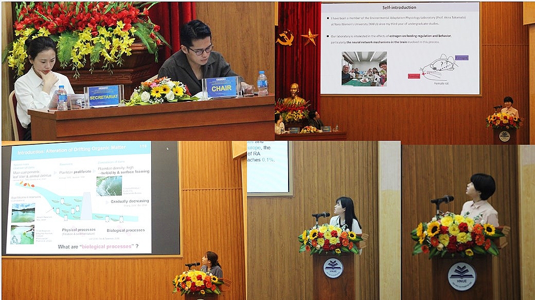 Session 4, chaired by Dr. Arizaldo Castro, featured deeply interdisciplinary topics, including aquatic ecology in dam-impacted systems (Naoko Hara – NWU), fish diversity in Tràng An (Nguyễn Trần Ngọc Mai – HNUE), plant-based antibody production (Ha Na Choi – GNU), effects of estrogen on sweet taste preference (Natsumi Kosugi – NWU), and the relationship between the first 1,000 days of life and stunting in children (Nguyễn Dung Nhi & Đỗ Tuấn Minh – HNUE).