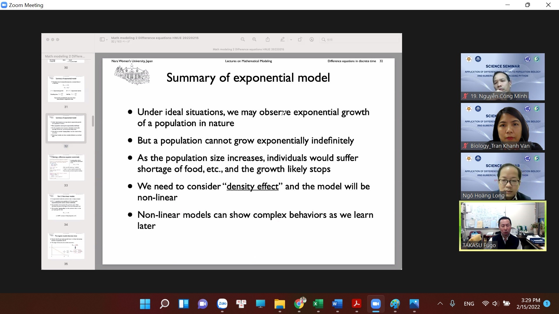To summarize, the presentation of Prof. Takasu Fugo with the topic "Application of difference equations to population biology and numerical simulation using python" has been successfully completed. The python model is really attractive to participants because of the great applications in the management of biological population data.