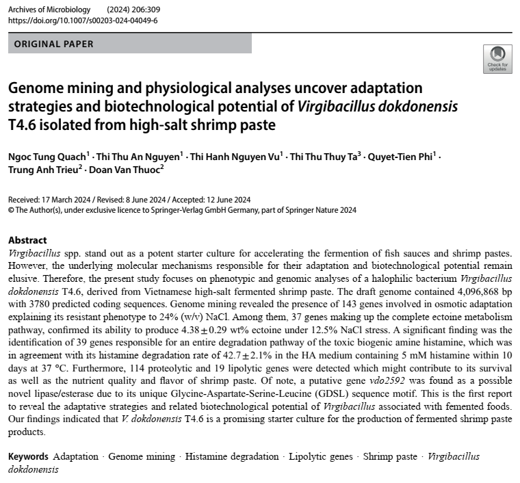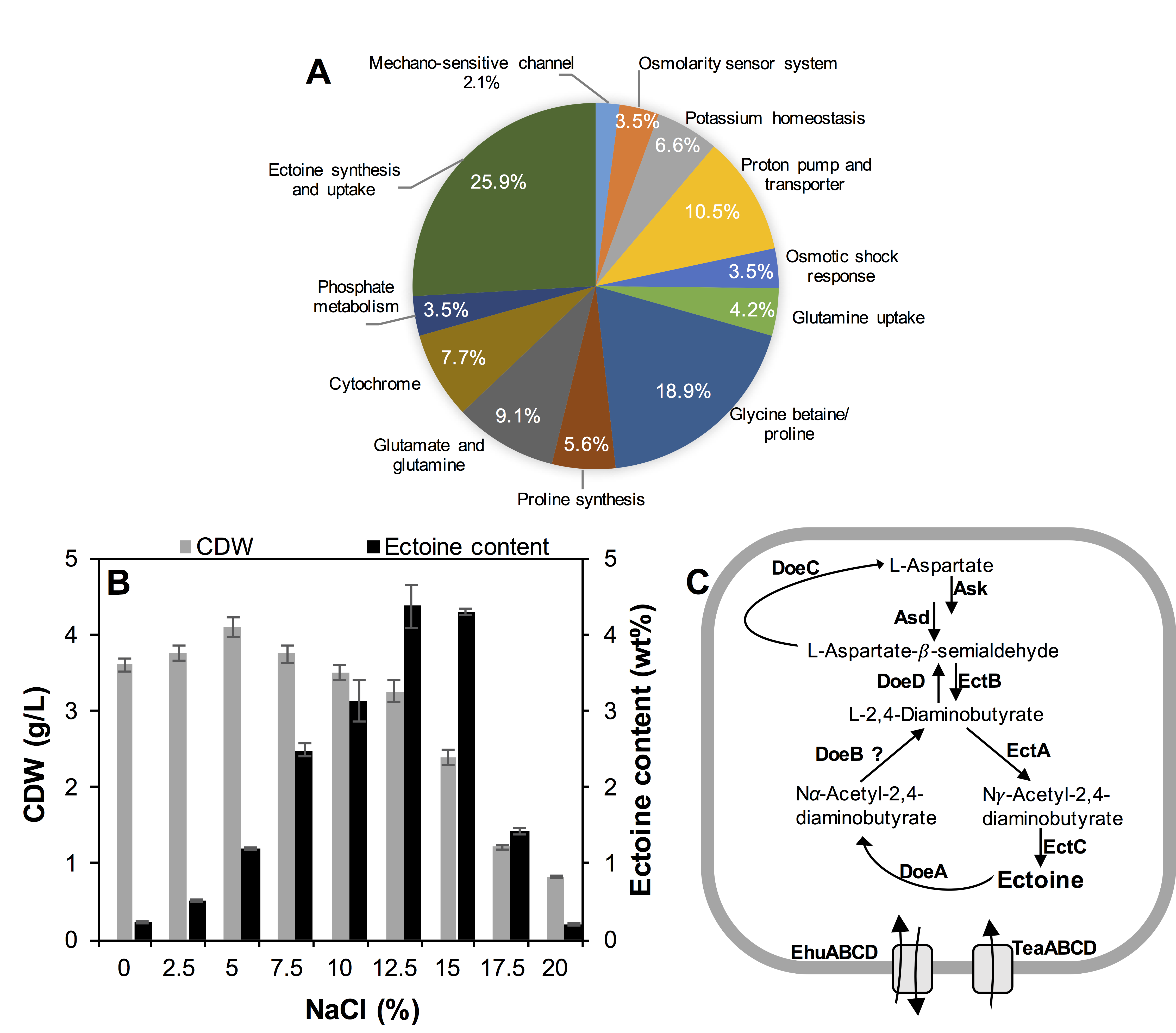 Figure 3. Genetic and molecular mechanisms underlying adaptation to salinity of V. dokdonensis T4.6. (A) Genetic determinants involved in the osmotic adaptation identified by genome mining. (B) Effect of NaCl concentrations on the cell dry weight (CDW) and ectoine production. (C) Proposed ectoine biosynthesis and biodegradation pathways of V. dokdonensis T4.6