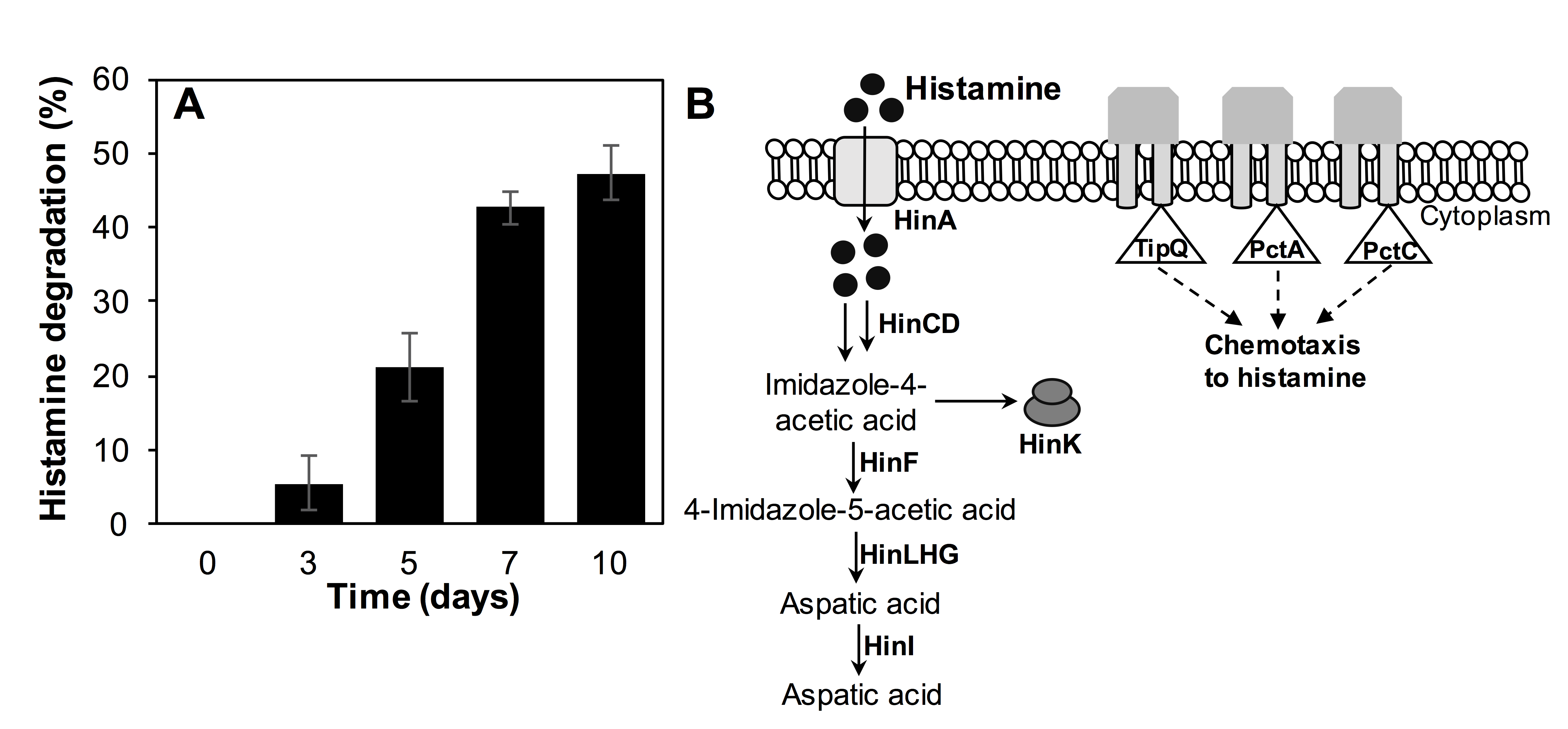 Figure 4. Biodegradation of histamine by the bacterial strain T4.6. (A) Time course of histamine degradation. (B) Proposed pathway for histamine degradation revealed by genomic analysis