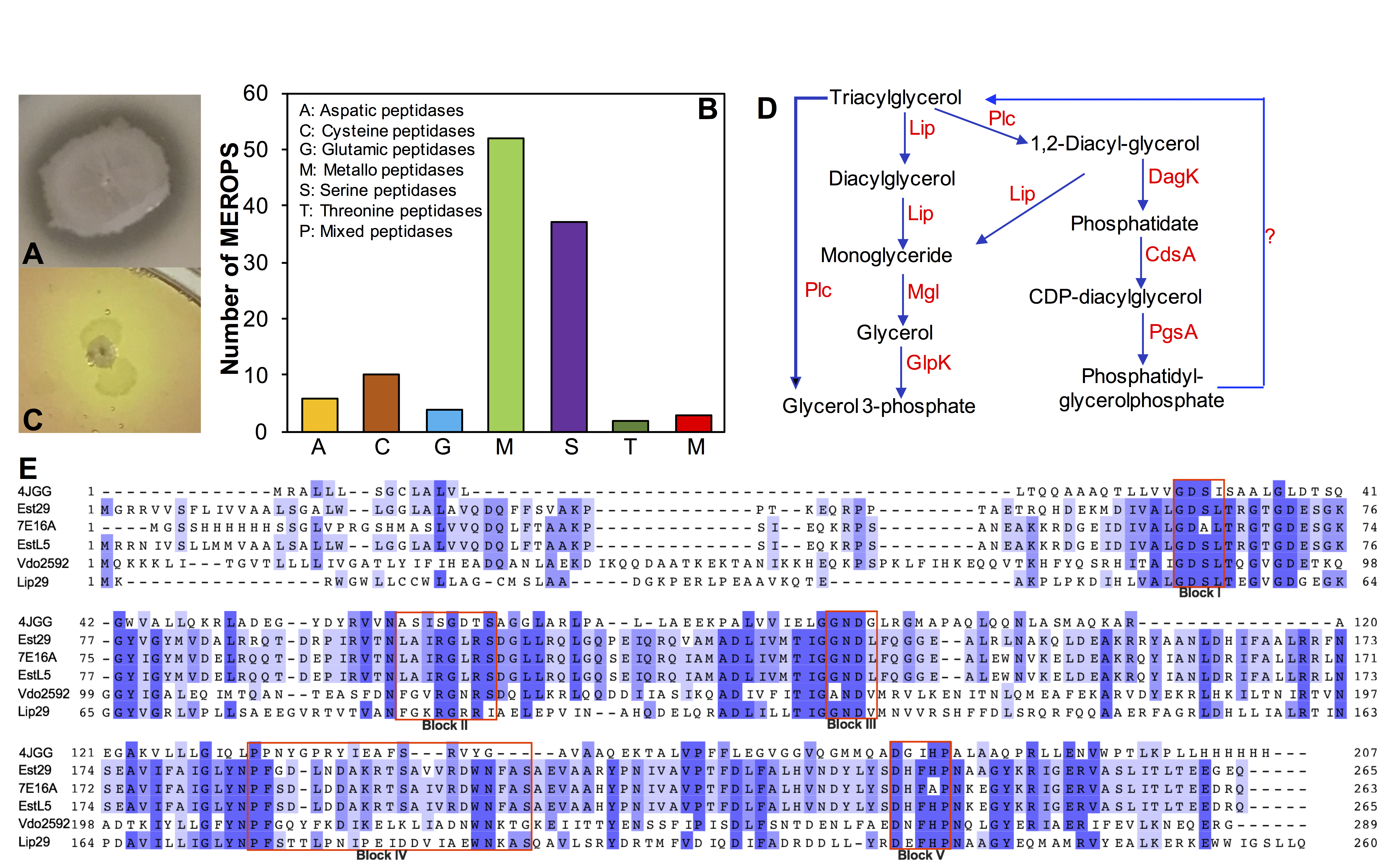 Figure 5. Proteolytic and lipolytic potential of V. dokdonensis T4.6. Proteolytic activity as detected by the skim milk agar plate (A) and proteolytic profiles predicted by genome mining (B). (C) Lipolytic activity indicated by the phenol red agar plate. (D) Proposed pathway associated with triacylglycerol catabolism constructed by genome mining. (E) Multiple alignment of Vdo2592 and other SGNH-hydrolase family of esterases and lipases. The blue color gradient indicates percentage of amino acid identity and 5 conserved blocks are boxed. The following protein sequences were aligned: 4JGG from Pseudomonas aeruginosa PAO1, Est29 from Geobacillus thermocatenulatus KCTC 3921, 7E16A from Geobacillus thermodenitrificans T2, EstL5 from G. thermodenitrificans T2, Vdo2592 from V. dokdonensis T4.6, and Lip29 from G. thermocatenulatus KCTC 3921