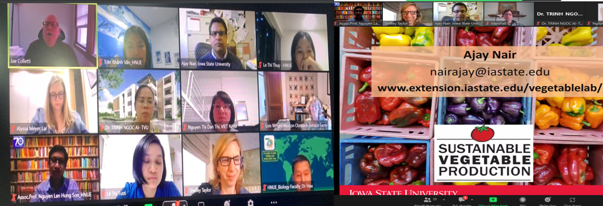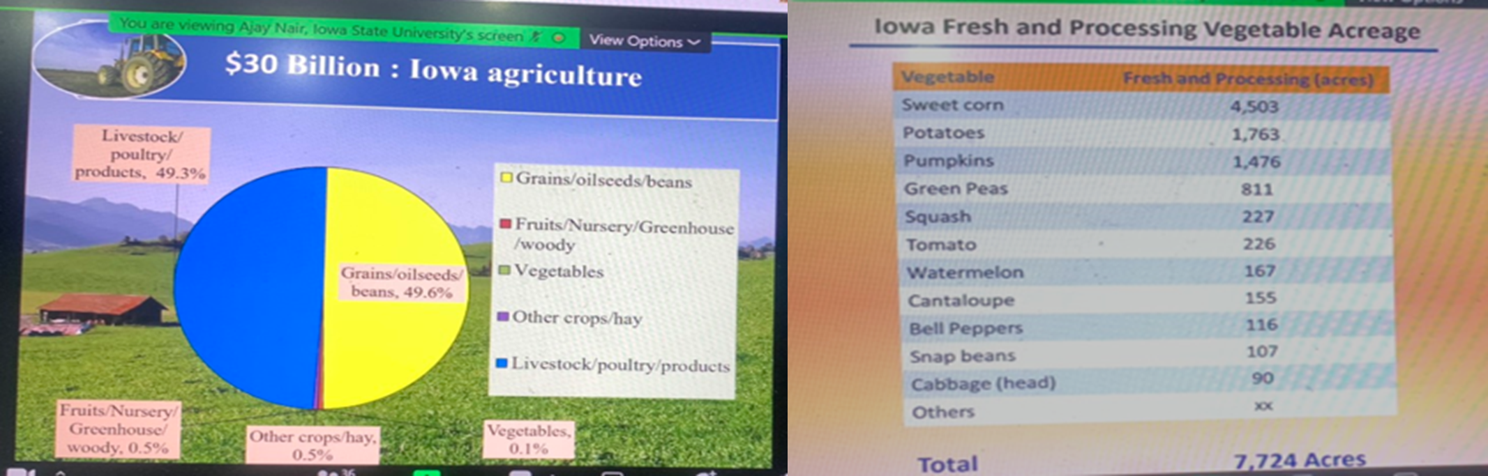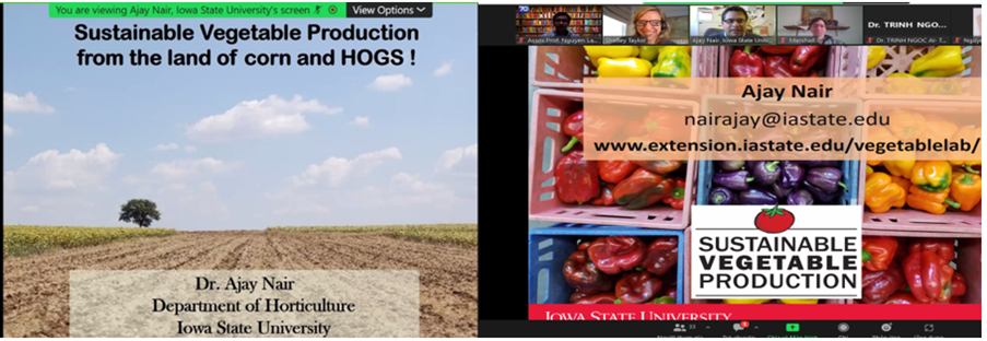 During the period of 1 hour 30 minutes, Dr. Nair Ajay presented an overview of the current state of agricultural land, income from the agricultural sector bringing about 30 billion dollars a year for the state of Iowa. Although only 0.1% of agricultural land is used for growing vegetables, towards increased awareness towards food quality, health standards and global environmental issues, vegetable production practices are being modified to minimize any deleterious effects to the environment and society.
