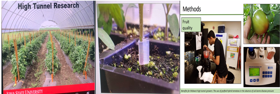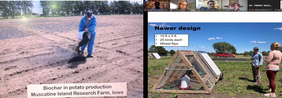 In winter season, almost soil areas are covered by snow, ice… therefore, the grower needs to use high tunnel to cultivate vegetable. A question is raised up: The resistance of tomato plants grown under these conditions is often quite weak as well as the reduced availability of nutrients, which can affect tomato yields. Therefore, Dr. Ajay tested tomato grafting technique to optimize high tunnel tomato production. Results from the tomato grafting indicate that potential grafting rootstocks that could be used to mitigate soil-related issues in tomato production as well as increase the yield of tomato up to 1.5 times. Or with sandy areas, the amount of carbon in the soil is reduced, so adding biochar to potato soil increases the yield of large potatoes. Another interesting new practice in Iowa nữa là intergrating vegetable and poultry production for sustainable cropping systems to increase the organic nitrogen in soil, then increase soil health, soil resiliency as well as bring profitability to farmers.