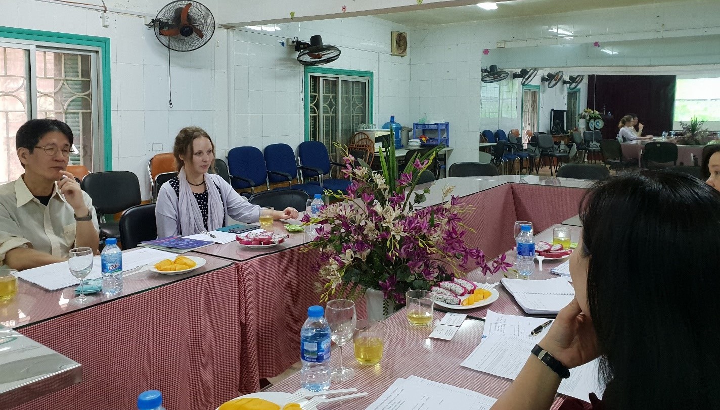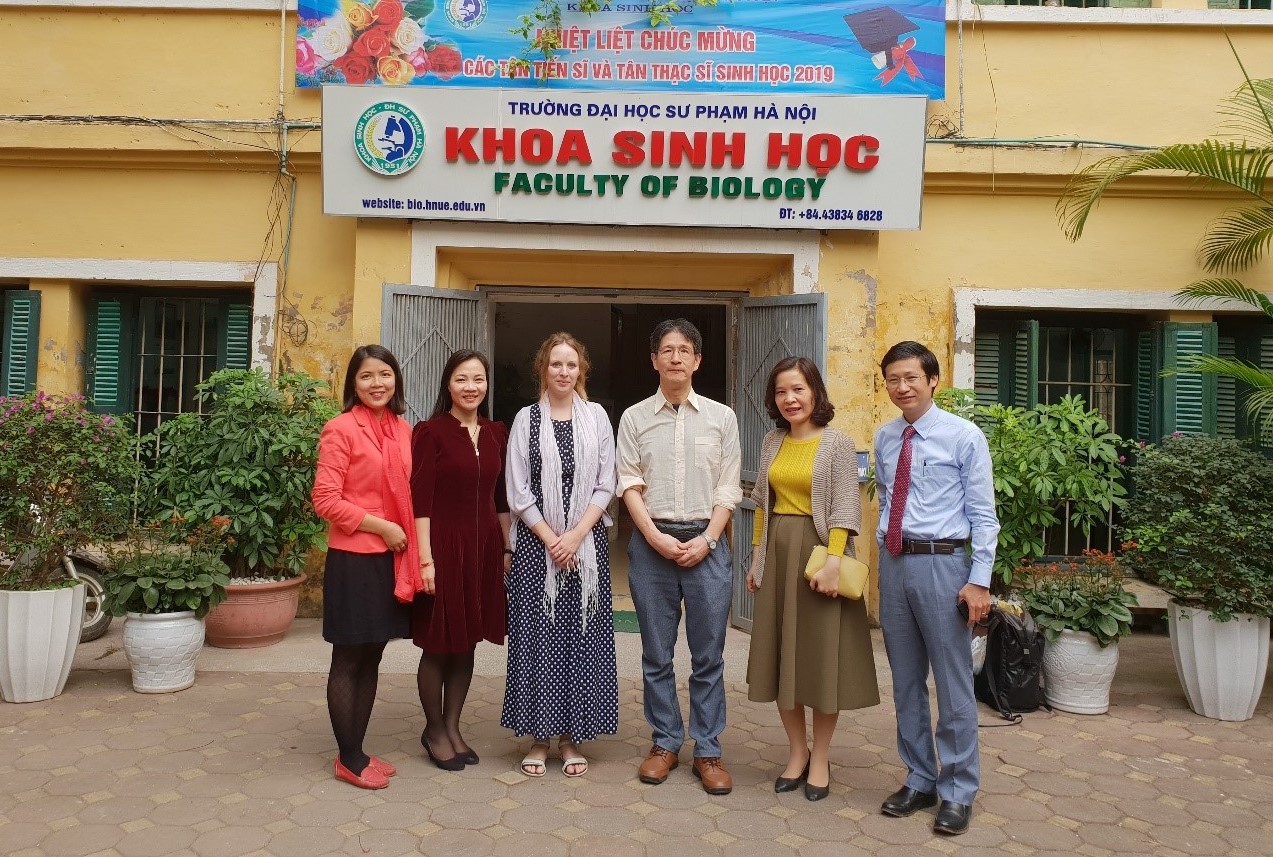 Assoc.Prof. Nguyen Lan Hung Son - Dean of Faculty, Assoc.Prof. Tran Thi Thanh Huyen - Deputy Dean, Dr. Tran Khanh Van - Head of Department of Plant Physiology and Application, International cooperation Assistant, Dr. Tran Thi Thuy - Head of Department of Biotechnology - Microbiology discussed with Prof. Taku MISONOU and Dr. Fomichova Kseniya from Faculty of Environmental Sciences and Life, Yamanashi University, Japan on biology and environmental science education at universities of Vietnam in general and a case of Hanoi National University of Education.