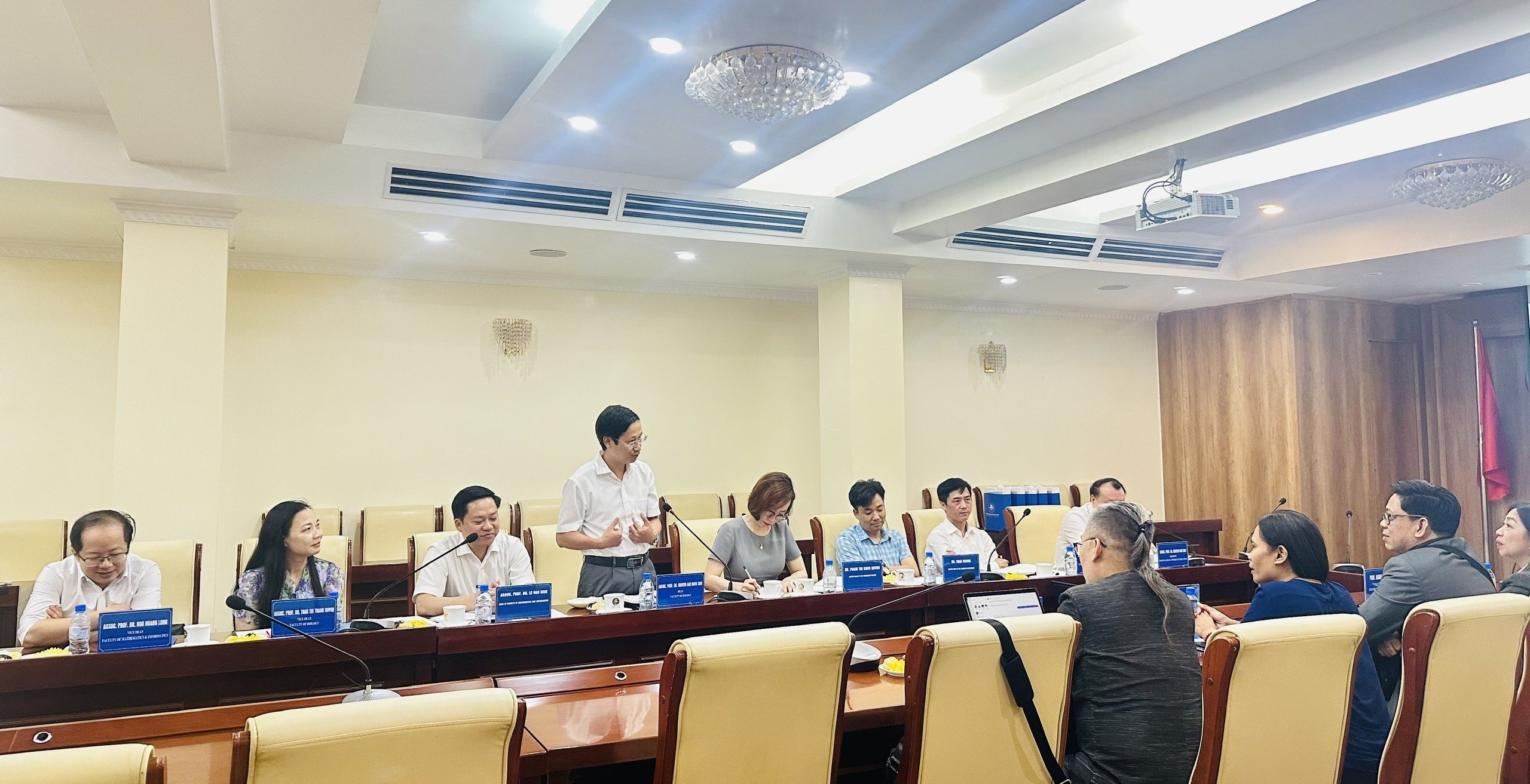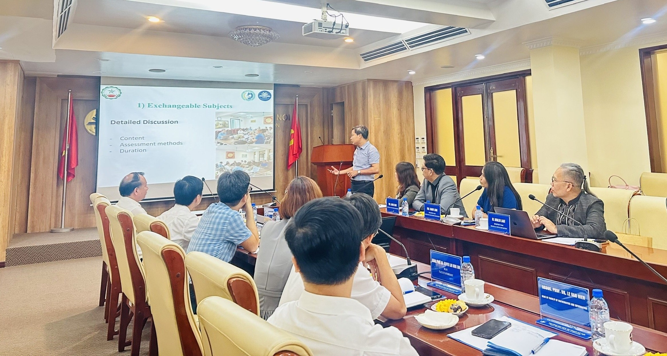 Next, Associ.Prof.Dr. Tran Duc Hau presented an overview of several issues for discussion, including requirements for choosing equivalent units, duration, assessment and the launching time. He reported a list of exchangeable subjects approved by the Science and Training Council of the Faculty of Biology, detailing subjects that students from HNUE should select to study in DLSU_D and vice versa for students from DLSU_D.