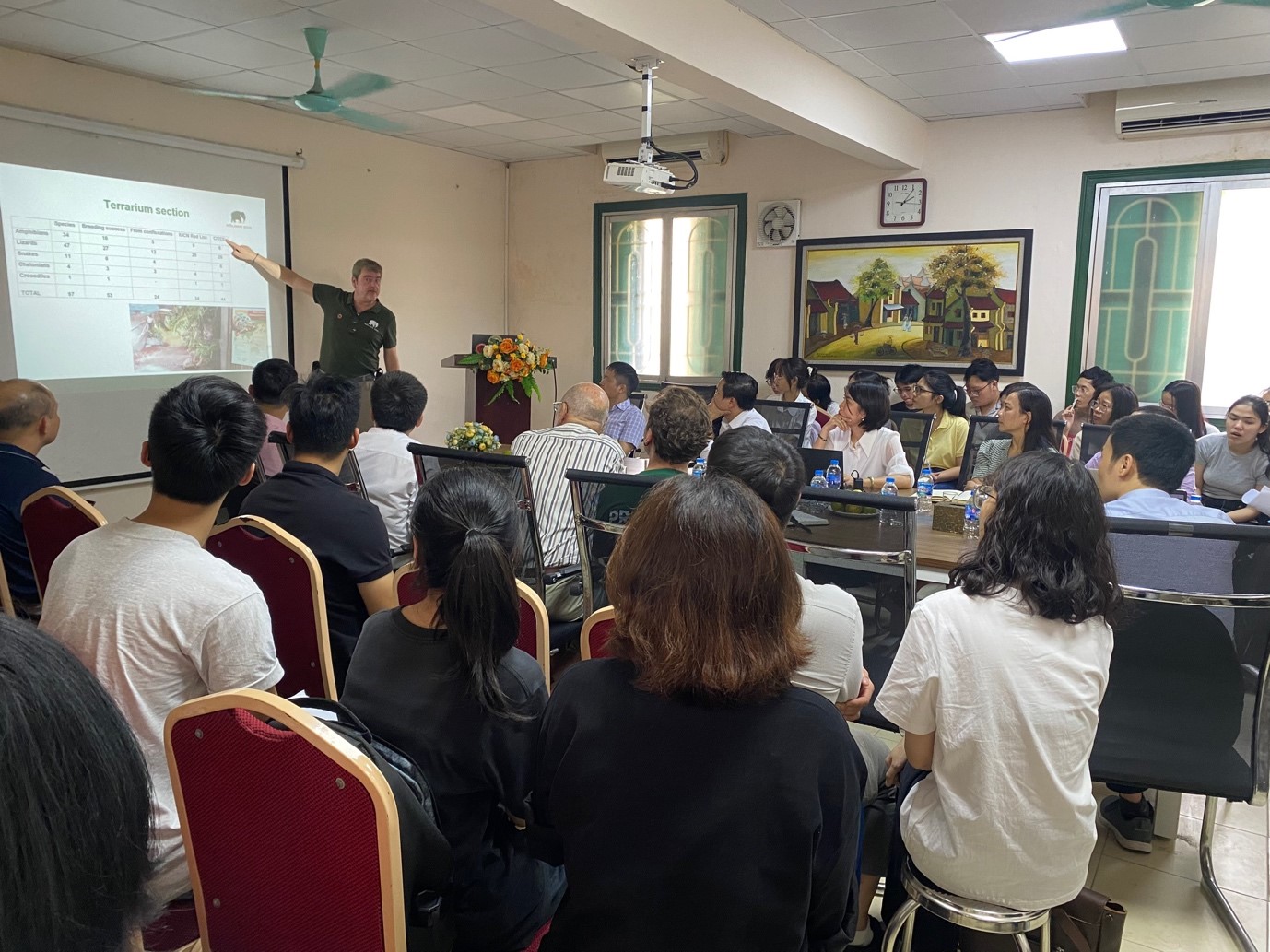 Next, Prof. Thomas Ziegler reported 25 hot spots for biodiversity conservation in the world, including Vietnam, where many rare and endangered animal species inhabit. He mentioned “The time is now” for implementing the topical zoo-initiated conservation campaigns dealing with Vietnam’s unique biodiversity. Currently, there is a combination of activities between German zoos and related Insstitutes in Vietnam in preserving a number of species namely Vietnamese crocodile newt, Spotted softshell, Four-eyed turtle, Tiger geckos, Magnolia snail, Nuichua stick insect, Hillstream loach, Mossy frogs, Vietnamese pond turtle, Vietnamese crocodile lizard. Last, he shared a network to highlight and help to conserve the biodiversity hotspot of Vietnam “VIETNAMAMAZING - SAVE NATURE” and he conveyed a very clear message calling for teamwork in preserving Vietnam's species.