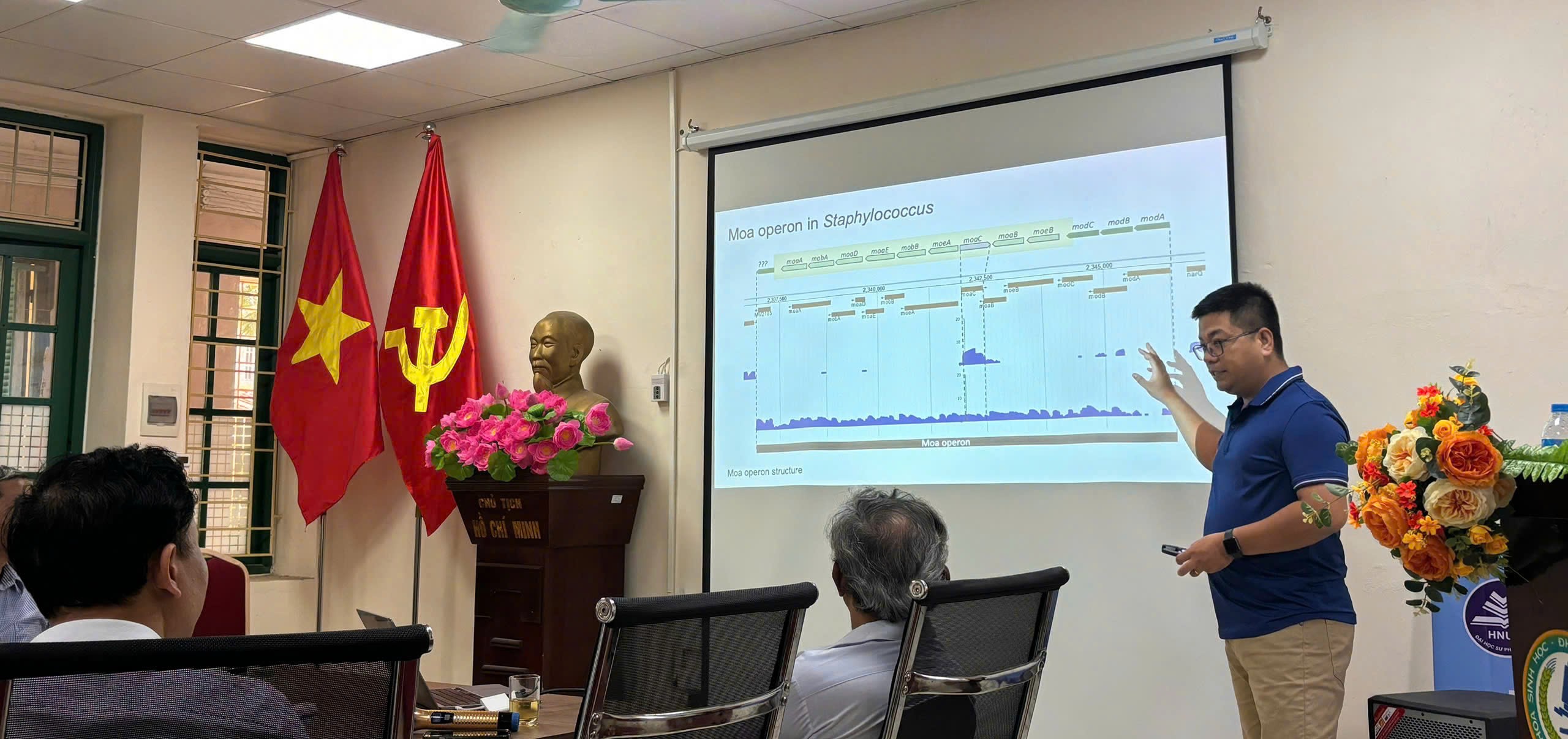 Dr. Trieu Anh Trung with the topic 'Role of non-contiguous operons in regulation of gene expression in bacteria' presented the results of basic research on the model of non-contiguous operons in bacteria on Staphylococcus aureus. This was a common model found in Gram positive bacteria. The research question was how this operon model affects the regulation of gene expression in bacteria. The results of the research with the Moco biosynthetic pathway studied in S. aureus with noncontiguous operons of moaC. The significance of the research could be the premise for finding ways to control pathogenic bacteria strains such as S. aureus. This was also an issue of interest to discuss with the speaker, as well as issues related to the techniques used in the research, the feasibility of applying these techniques in Vietnam.